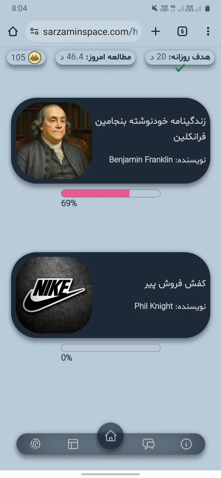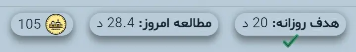 در بالای صفحه، هدف روزانه کاربر، مقدار مطالعه امروز کاربر، و تعداد سکههایی که کاربر جمع کرده، قابل دیدن است. اینکه از این سکهها چه استفادههایی میشود کرد در بخشهای بعد گفته خواد شد.